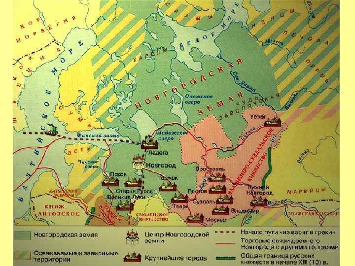 ? Каковы природные условия Новгородской земли? Холодный, влажный климат. Основные природные зоны – тайга и тундра. Обилие лесов, озер и болот. Бедные болотистые почвы. Большие запасы древесины, строительного камня, соли, болотных железных руд, пушного и морского зверя. Крупные реки: Нева, Волхов, Ловать, Онега, Сев. Двина. Удобный выход к морю: Волхов – Ладожское озеро – Нева – Финский залив. Главные торговые пути: Путь из Варяг в Греки.