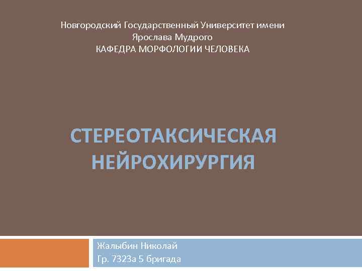 Новгородский Государственный Университет имени Ярослава Мудрого КАФЕДРА МОРФОЛОГИИ ЧЕЛОВЕКА СТЕРЕОТАКСИЧЕСКАЯ НЕЙРОХИРУРГИЯ Жалыбин Николай Гр. 7323 а 5 бригада
