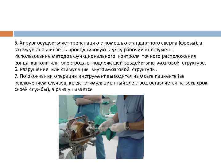 5. Хирург осуществляет трепанацию с помощью стандартного сверла (фрезы), а затем устанавливает в проводниковую втулку рабочий инструмент. Использование методов функционального контроля точного расположения конца канюли или электрода в подлежащей воздействию мозговой структуре. 6. Разрушение или стимуляция внутримозговой структуры. 7. По окончании операции инструмент выводится из мозга пациента (за исключением случаев, когда стимуляционный электрод оставляется на весь срок своей службы), а рана ушивается.