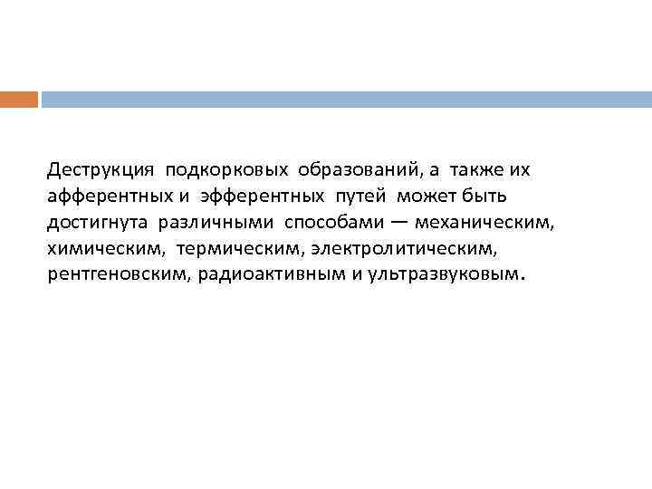 Деструкция подкорковых образований, а также их афферентных и эфферентных путей может быть достигнута различными способами — механическим, химическим, термическим, электролитическим, рентгеновским, радиоактивным и ультразвуковым.