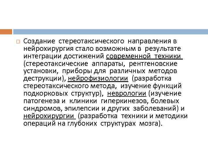Создание стереотаксического направления в нейрохирургия стало возможным в результате интеграции достижений современной техники (стереотаксические аппараты, рентгеновские установки, приборы для различных методов деструкции), нейрофизиологии (разработка стереотаксического метода, изучение функций подкорковых структур), неврологии (изучение патогенеза и клиники гиперкинезов, болевых синдромов, эпилепсии и других заболеваний) и нейрохирургии (разработка техники и методики операций на глубоких структурах мозга).