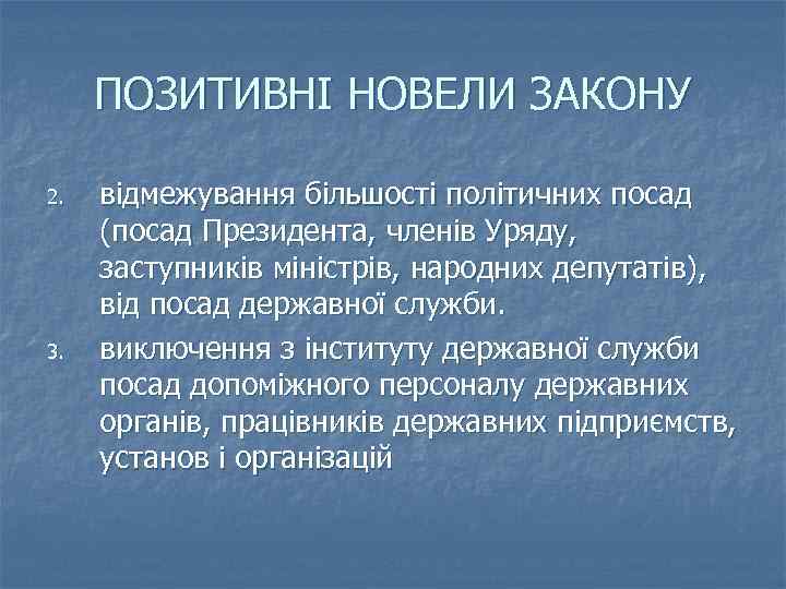 ПОЗИТИВНІ НОВЕЛИ ЗАКОНУ 2. 3. відмежування більшості політичних посад (посад Президента, членів Уряду, заступників міністрів, народних депутатів), від посад державної служби. виключення з інституту державної служби посад допоміжного персоналу державних органів, працівників державних підприємств, установ і організацій