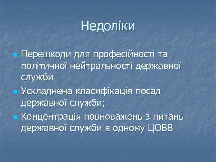 Недоліки n n n Перешкоди для професійності та політичної нейтральності державної служби Ускладнена класифікація посад державної служби; Концентрація повноважень з питань державної служби в одному ЦОВВ