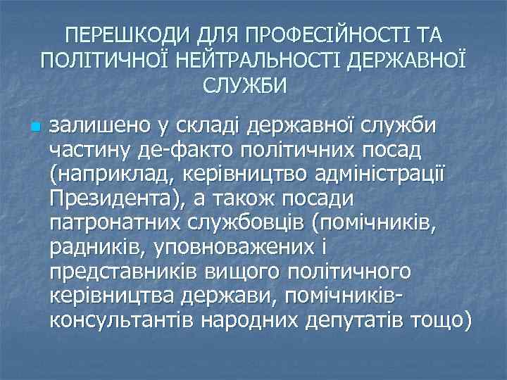 ПЕРЕШКОДИ ДЛЯ ПРОФЕСІЙНОСТІ ТА ПОЛІТИЧНОЇ НЕЙТРАЛЬНОСТІ ДЕРЖАВНОЇ СЛУЖБИ n залишено у складі державної служби частину де-факто політичних посад (наприклад, керівництво адміністрації Президента), а також посади патронатних службовців (помічників, радників, уповноважених і представників вищого політичного керівництва держави, помічниківконсультантів народних депутатів тощо)