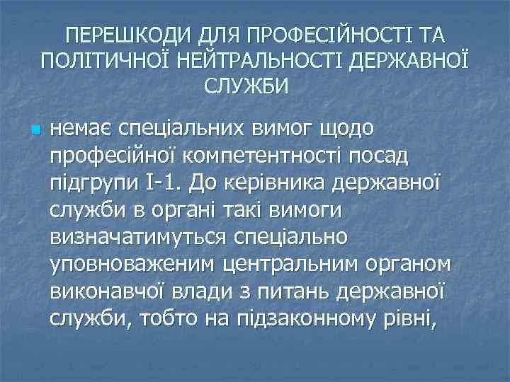 ПЕРЕШКОДИ ДЛЯ ПРОФЕСІЙНОСТІ ТА ПОЛІТИЧНОЇ НЕЙТРАЛЬНОСТІ ДЕРЖАВНОЇ СЛУЖБИ n немає спеціальних вимог щодо професійної компетентності посад підгрупи І-1. До керівника державної служби в органі такі вимоги визначатимуться спеціально уповноваженим центральним органом виконавчої влади з питань державної служби, тобто на підзаконному рівні,