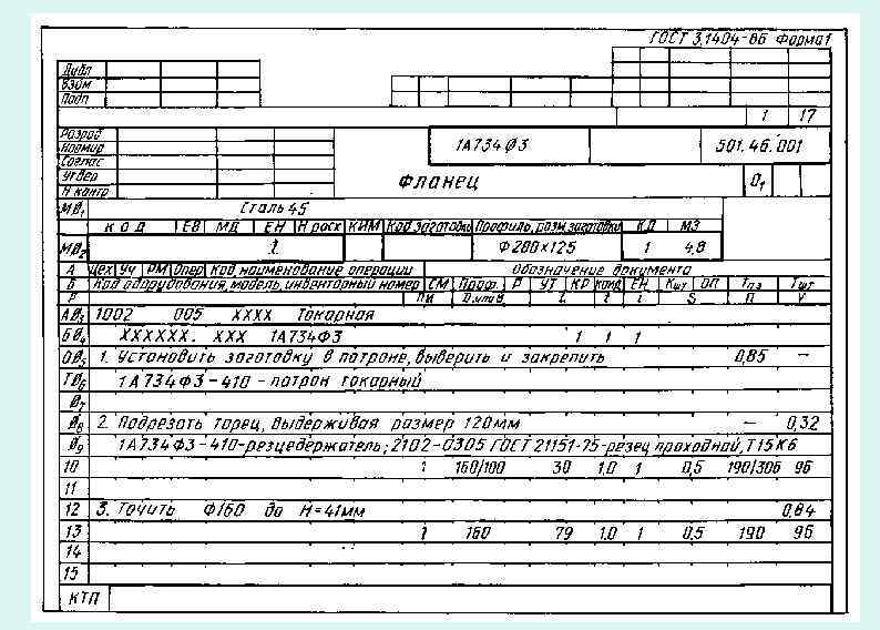 Операционная карта (ОК) предназначена для описания технологической операции с указанием последовательности выполнения переходов, средств технологического оснащения, режимов и трудовых затрат. О К применяется в комплекте с КН/П и К Э. В ней приводятся: наименование операции; материал (краткая форма записи наименования и марки материала по ГОСТ 3. 1104— 81), его твердость, код по классификатору; код единицы измерения массы и размеров детали, заготовки по классификатору; профиль и размеры исходной заготовки (длина, ширина, высота); масса заготовки; количество одновременно обрабатываемых деталей; краткое наименование оборудования и устройства ЧПУ; обозначение программы в соответствии с требования-ми отраслевой нормативно-технической документации; основное и вспомогательное время на переход (операцию); нормы подготовительно-заключительного и штучного времени на операцию; информация по применению смазочно-охлаждающей жидкости; номер позиции инструментальной наладки; расчетный размер обрабатываемой детали (диаметр, ширина); расчетная длина рабочего хода; глубина резания, число проходов, подача, ч а с т о т а в р а щ е н и я , с к о р о с т ь р е з а н и я. ОК применяют для описания единичных, типовых (групповых) технолог. опер.