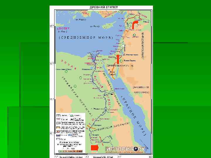 Первый поход Тутмоса III § Направлен против народа черену, населявшего Палестину и Финикию § Разгромлена коалиция городов во главе с Мегиддо (на следующем сайте отмечен белой стрелкой; красные стрелки показывают направления походов)