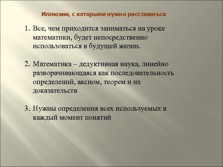 Иллюзии, с которыми нужно расставаться 1. Все, чем приходится заниматься на уроке математики, будет непосредственно использоваться в будущей жизни. 2. Математика – дедуктивная наука, линейно разворачивающаяся как последовательность определений, аксиом, теорем и их доказательств 3. Нужны определения всех используемых в каждый момент понятий