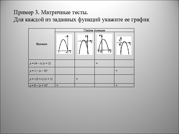 Пример 3. Матричные тесты. Для каждой из заданных функций укажите ее график График функции Функция y = (4 – x) (x + 2) + y = 1 – (x – 3)2 + y = –(2 + x) (x + 1) y = 9 – (x + 3)2 + + +