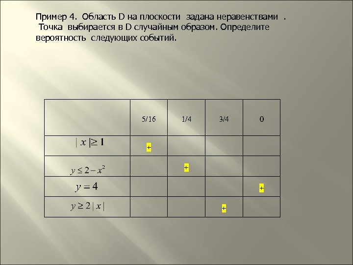 Пример 4. Область D на плоскости задана неравенствами . Точка выбирается в D случайным образом. Определите вероятность следующих событий. 5/16 1/4 3/4 0 + +