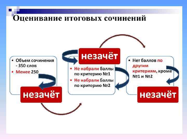 «Незачёт» ставится при условии, если сочинение написано без привлечения литературного материала или в нём существенно искажено содержание произведения, или литературные произведения лишь упоминаются в работе, не становясь опорой для аргументации. Во всех остальных случаях выставляется «зачёт» .