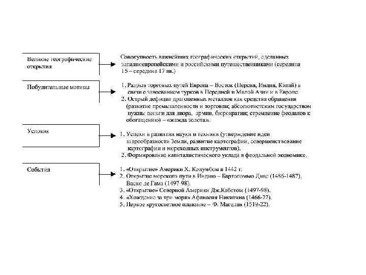 КАПИТАЛИЗМ • • • • 3. Генезис капиталистической экономики и велики географические открытия 3. 1. Заокеанская экспансия европейских стран и возникновение мирового рынка. В конце XV начале XVI вв. в результате великих географических открытий были установлены прямые стабильные экономические связи между Европой и другими частями света. Материальные ресурсы из Америки, Азии, Африки достаточно быстро были влиты в экономики стран Западной Европы. Совокупность важнейших географических открытий, сделанных западноевропейскими и российскими путешественниками (середина 15 - середина 17 вв. ) 1. Разрыв торговых путей Европа - Восток (Персия, Индия, Китай) в связи с завоеванием турков в Передней и Малой Азии и в Европе. 2. Острый дефицит драгоценных металлов как средства обращения (развитие промышленности и торговли абсолютистским государством нужны деньги для двора, армии, бюрократии; стремление феодалов к обогащению) - "жажда золота". 1. Успехи в развитии науки и техники (утверждение идеи шарообразности Земли, развитие картографии, совершенствование картографии и мореходных инструментов). 2. Формирование капиталистического уклада в феодальной экономике. 1. "Открытие" Америки Х. Колумбом в 1442 г. 2. Открытие морского пути в Индию - Бартоломью Диас (1486 -1487), Васко де Гама (1497 -98). 3. "Открытие" Северной Америки Дж. Каботом (1497 -98). 4. "Хождение за три моря" Афанасия Никитина (1466 -72). 5. Первое кругосветное плавание - Ф. Магелан (1519 -22). Рис. 5. Великие географические открытия: мотивы, условия, события.