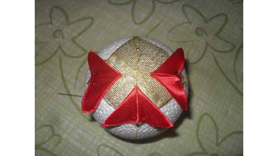 Загибаем уголок «конвертиком» и закрепляем булавкой так, чтобы линия сгиба совпадала с разметкой на шаре.