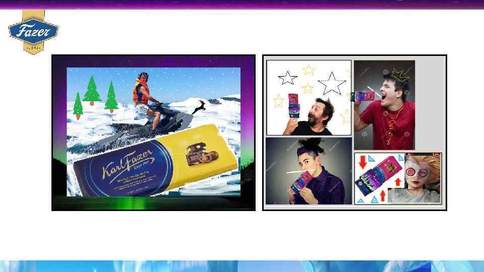 | СИЯНИЕ ВКУСА Само название, сам образ, сама нить повествования настолько широка, что из нее может быть большое количество идей. Например: • Для участия в акции регистрируйтесь, и загружайте фото, самостоятельно обработанное в любом графическом редакторе, на котором вы и шоколад Fazer. Paint Photo. Shop или редактор телефона. Вы можете брать фото из интернета или делать их самостоятельно. • На промо стойках в магазинах устраивать конкурс, «какой это вкус? » . Если угадали - Получили маленький приз. Сияние вкуса. Промо видео ролики для инстаграмм – Как радуются дети когда им дарят маленькую конфетку. Когда ребенок выходит из детского сада. На новый год на елке, на улице как перекус. Мы не говорим что шоколад надо есть детям постоянно, мы говорим, что он подходит в любой момент, вкус праздника у тебя в кармане. • На шоколадке код, регистрируйся по ссылке, грузи туда свое фото в особом месте, где шоколад Fazer дарит праздник. Например один в лесу с шоколадкой. В вагоне поезда в метро. На остановке с конфеткой. Маленький миг радости. А как сияешь ты ? ! • Несколько категорий призов. Поездка на северное сияние в Финляндию. Увидеть оленей в Лапландии. Зимний отдых 2 дня в санатории в лесах России. Поездка к деду морозу. Поездка на снегоходах. Тур 1 день. Билеты на новогоднюю елку в кремль. Билеты на весь день в парк развлечений. Запас шоколада. Маленькие пробники на стойках или даже в журналах, с надписью пожеланий. Плоский маленький листик шоколада 3 х3 см.