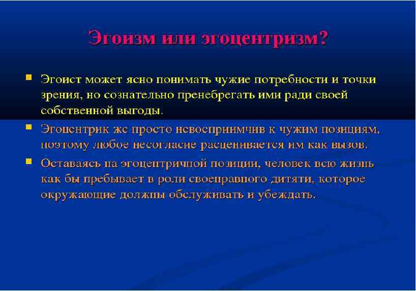 Во-вторых, важно осознать, что эгоцентризм присущ детям. А детям, которым 20, 40 или 50 лет, он несколько не свойственен. Окружающим важно не потакать эгоцентрику и не принимать его стиль жизни, тогда он, возможно, поймет, что уже вышел из детского возраста.