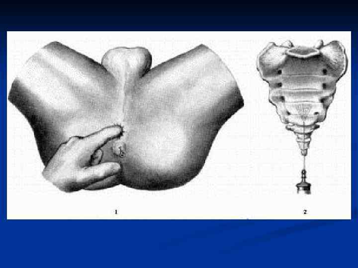 n Пресакральную новокаиновую блокаду производят при трещинах заднего прохода с выраженным болевым синдромом, а также с целью обезболивания при операциях на анальной области. Положение больного на спине с приведенными к животу ногами. Тонкой длинной иглой прокалывают кожу на середине расстояния между копчиком и заднепроходным отверстием. Указательным пальцем левой кисти, введенным в прямую кишку, контролируют дальнейшее продвижение иглы. Ее проводят по вогнутой (передней) поверхности крестца, предпосылая вперед струю раствора новокаина. Пальцем в прямой кишке определяют ползучий инфильтрат от вводимого раствора новокаина и ориентируются в направлении продвижения иглы. В пресакральную клетчатку (между крестцом и задней стенкой прямой кишки) вводят 80— 100 мл 0, 25% раствора новокаина.