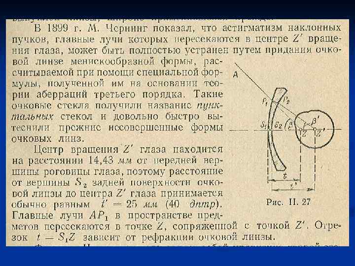Линзовый глаз Отсутствие аберраций Линзы, у которых показатель преломления изменяется вдоль их диаметра, крайне трудно изготовить оптику, потому что каждый сорт стекла имеет определенную и фиксированную плотность. Однако для биологических систем изготовить линзы с переменным показателем преломления – это легко, потому что линзы могут вырастать из собственного центра. Глаза морских животных, включая рыб и моллюсков, имеют сферические градиентные линзы, которые корректируют аберрации.