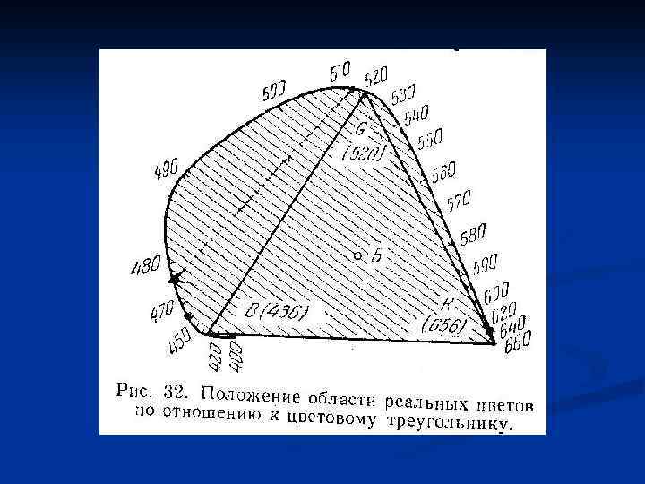 Графическое представление колориметрической системы. Цветовой треугольник. В вершинах равностороннего треугольника располагаются основные цвета R, G, B, а в центре – белый цвет. Цвета, получаемые смешением двух основных цветов без участия третьего будут располагаться по сторонам треугольника. Всякий цвет, получаемый сочетанием всех трех основных цветов, будет изображаться на диаграмме точкой, лежащей внутри треугольника. Положение этой точки определяется тем, что она представляет собой центр тяжести треугольника, если в его вершинах расположить грузы, веса которых пропорциональны числам r, g, b.