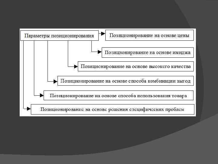 Известно семь подходов к стратегии позиционирования: 1) использование характеристик продукта или выгоды потребителя, 2) подход «цена — качество» , 3) подход "использования или применения", 4) подход "пользователь продукта", 5) подход "класс продукта", 6) подход "культурный символ", 7) "конкурентный" подход.