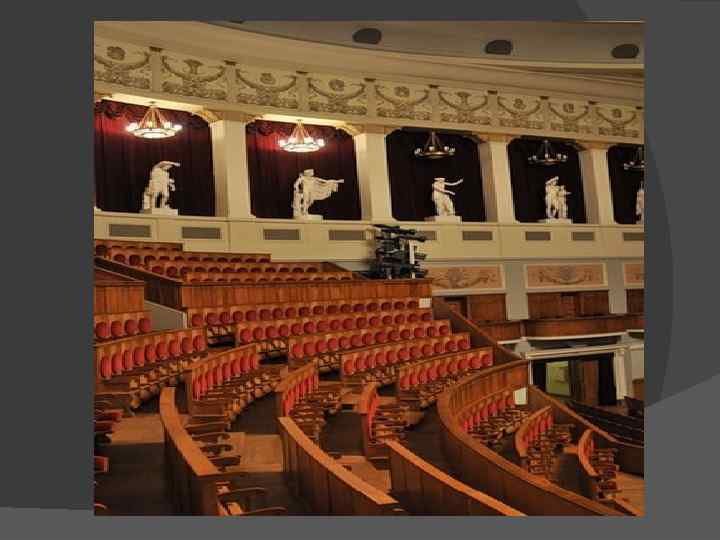 Особый архитектурный прием использован в решении верхней части интерьера большого зрительного зала - мощная галерея над амфитеатром, которая обрамляет площадь живописного плафона с хрустальной люстрой диаметром 6 метров и весом около 2 -х тонн. Оригинален потолок зрительного зала - своеобразный акустический экран из прессованного картона. Пространство между колоннами верхней галереи заполнено 16 скульптурами - копиями произведений античных мастеров.