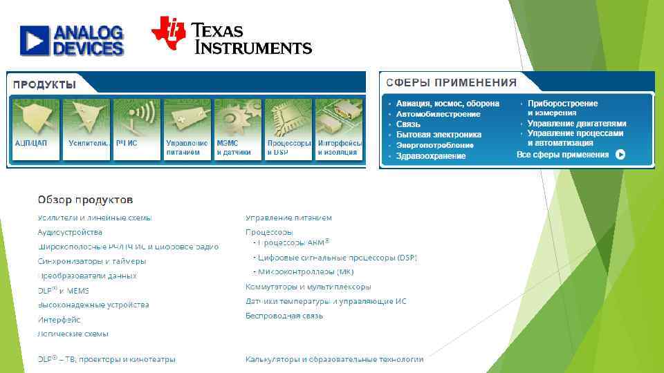 ANALOG DEVICES - признанный мировой лидер в области производства интегральных микросхем для аналоговой и цифровой обработки сигналов (более 7500 наименований) ATMEL - Микроконтроллеры, аппаратно и программно совместимые c микроконтроллерами фирмы Intel и новые мощные RISC-микроконтроллеры AVR и ARM ; память: микросхемы ПЗУ, однократно программируемые и с электрическим перепрограммированием (Flash ПЗУ) с байтовым или однобитным выходом ; микросхемы программируемой логики (ПЛИС), от простейших PAL, содержащих 8 триггеров, до кристаллов высокой степени интеграции (FPGA), содержащих более тысячи триггеров;