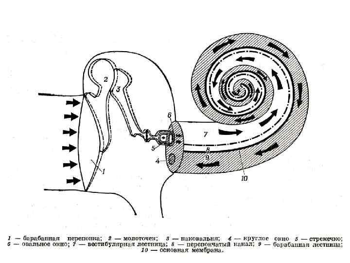 Движения основной мембраны Волна давления распространяется по всей длине улитки за 20 миллисек. На основной мембране формируется бегущая волна. Мембрана выбухает у овального окна, затем это выбухание постепенно перемещается по мембране по направлению к вершине. Свойства бегущей волны являются следствием упругих свойств мембраны и её геометрии (форма улитки). Мембрана расширяется по направлению от овального окна к вершине улитки. Её жёсткость так же возрастает – у вершины она в 100 раз менее упруга, чем у овального окна. Амплитуда выбухания постепенно увеличивается по мере его продвижения. Точка на мембране, в которой оно достигает максимального размера, зависит от частоты звука. При дальнейшем продвижении к онцу мембраны волна быстро затухает. Для звуков высокой частоты максимальное смещение основной мембраны происходит возле овального окна, в остальной же части мембраны активность очень слаба. При звуках низкой частоты выбухание перемещается до самой вершины и достигает максимальной амплитуды непосредственно у конца мембраны.