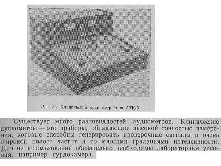 Аудиометр – генератор звуковой частоты, частоту и интенсивность звука можно регулировать. Чистый звуковой тон от аудиометра подаётся на наушники или кость позади уха. «Маскировка» второго уха белым шумом. Сурдокамера.