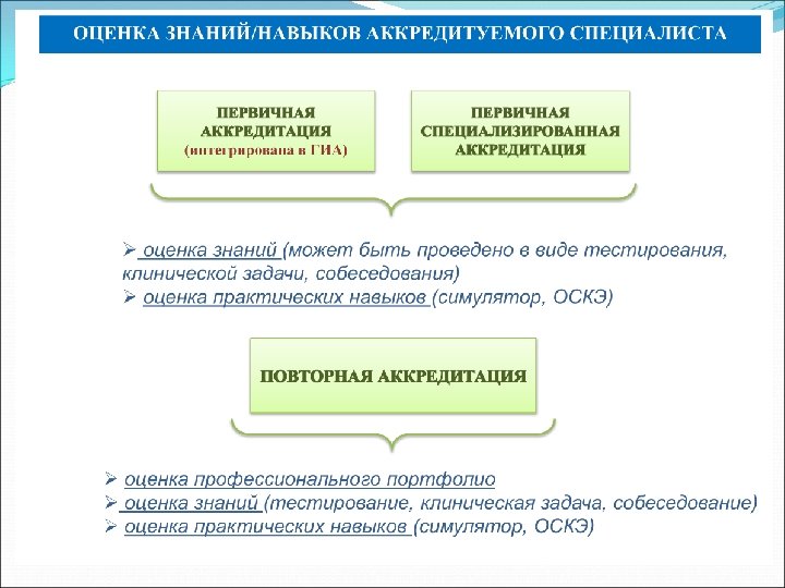 ВИДЫ Первичная аккредитация будет проводится в целях определения АККРЕДИТАЦИИ: готовности к осуществлению медицинской (фармацевтической) деятельности лица, завершившего освоение основной образовательной программы высшего образования уровня бакалавриата и (или) магистратуры и (или) специалитета или среднего профессионального образования в соответствии с федеральными государственными образовательными стандартами. Первичная специализированная аккредитация будет проводится в целях определения готовности к осуществлению медицинской деятельности лица, освоившего программу ординатуры (интернатуры) в соответствии с федеральными государственными образовательными стандартами, лица, освоившего новую квалификацию и лица, освоившего новый навык в рамках своей квалификации (специальности). Повторная аккредитация будет проводится в целях подтверждения готовности к осуществлению медицинской деятельности лица, освоившего образовательный цикл в ходе непрерывного профессионального развития.