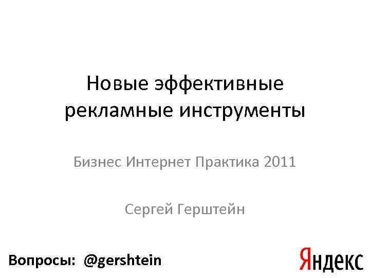 Новые эффективные рекламные инструменты Бизнес Интернет Практика 2011 Сергей Герштейн Вопросы: @gershtein
