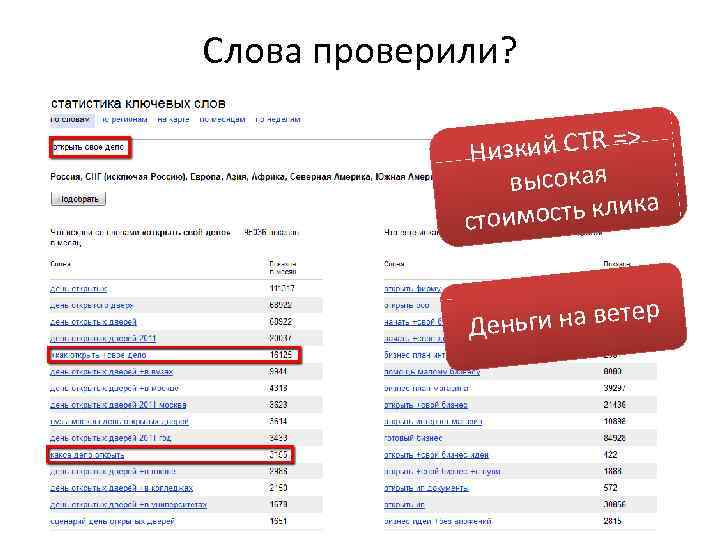 Слова проверили? > изкий CTR = Н высокая ость клика стоим [открыть своё дело] – хорошая ключевая фраза? ьги на ветер Ден