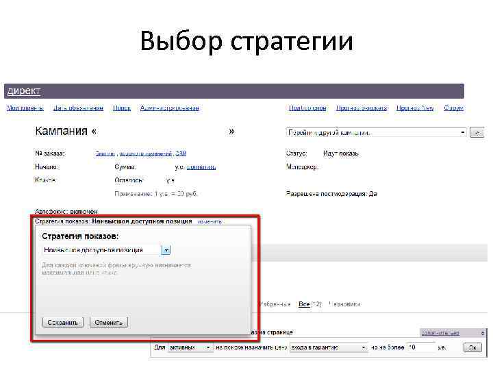 Директ: Новые автоматические стратегии • Было и раньше: – Наивысшая позиция – Недельный бюджет • Новое: – Показ в блоке по минимальной цене – Средняя цена клика • Максимум переходов по средней цене не выше заданной – Недельный пакет кликов • Указанное число переходов по минимальной цене