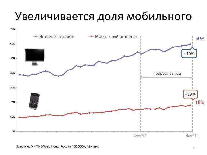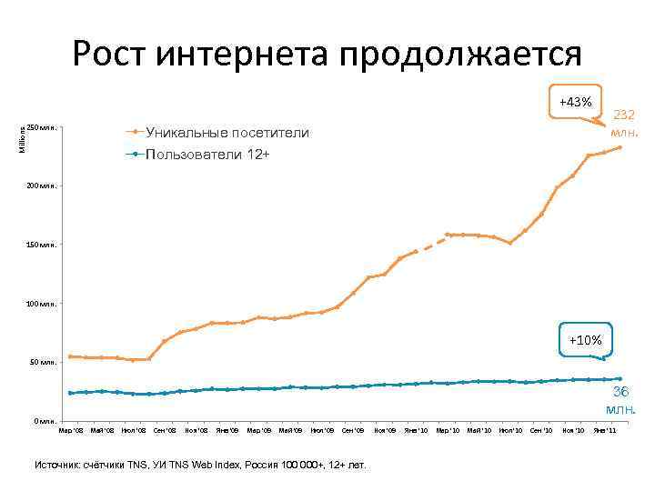 Рост интернета продолжается +43% 250 млн. 232 млн. Millions Уникальные посетители Пользователи 12+ 200 млн. 150 млн. 100 млн. +10% 50 млн. 36 млн. Мар '08 Май '08 Июл '08 Сен '08 Ноя '08 Янв '09 Мар '09 Май '09 Июл '09 Сен '09 Источник: счётчики TNS, УИ TNS Web Index, Россия 100 000+, 12+ лет. Ноя '09 Янв '10 Мар '10 Май '10 Июл '10 Сен '10 Ноя '10 Янв '11