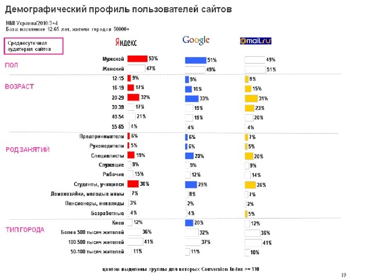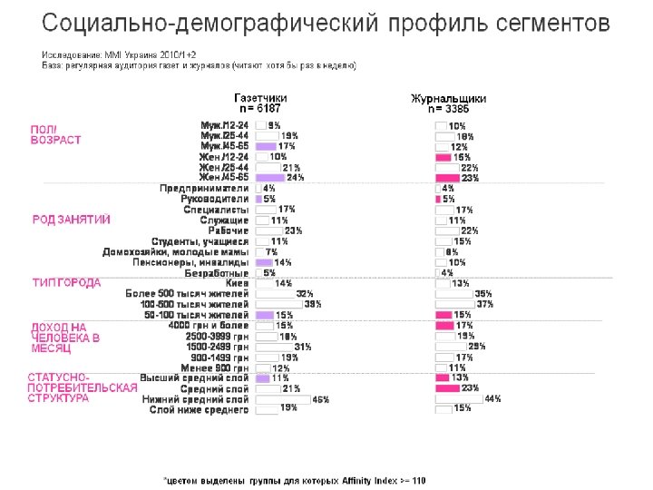Тематические сегменты среди аудитории газет Исследование: MMI Украина 2010/3+4 База: читатели газет (охват за средние сутки) РАЗВЛЕКАЮЩИЕСЯ Хит-парады, музыкальные обозрения Проведение досуга Путешествия и отдых Сексуальные отношения, эротика Мода, одежда ДЕЛОВЫЕ Городские новости, события Политические международные события Социальные проблемы Экономика, бизнес, финансы Политические события в России ТЕХНИКИ Авто-, мото- обозрения Спортивные новости, обозрения Недвижимость: покупка, продажа, аренда, новости Ремонт, обустройство жилья Техника, электроника, связь МОДНИКИ Косметика, парфюмерия, прически Светская хроника, статьи о знаменитостях Хит-парады, муз. обозрения Гороскопы, астрологические прогнозы Мода, одежда ВСЕЯДНЫЕ Всё интересно РАВНОДУШНЫЕ Нет особых предпочтений – читают также как все ХОЗЯЙСТВЕННЫЕ Здоровье, методы лечения, рецепты Кулинария, рецепты Семья, дети Дача, сад, огород ОБОЗРЕВАТЕЛИ Городские новости, события Политические международные события Политические события в России Программа телепередач Социальные проблемы Спортивные новости, обозрения Исторические обзоры Криминальная хроника доля этих сегментов среди читателей газет больше, чем среди населения в целом