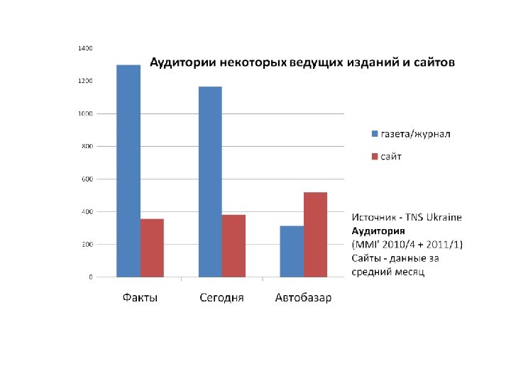 Кто нас читает? Исследование: MMI Украина 2010/3+4 База: население городов Украины 50 000+ в возрасте 12 -65 лет Самая рейтинговая ежедневная газета – 1 млн. 364 тыс. читателей* § 40 -65 лет (57%) § Жители Киева (21%), Запада (10%), Северо-Запада (6%), Юго-Запада (4%), Центра (9%), Севера (8%) § Средний слой (22%), Высший средний слой (11%) § Не представляют жизни без книг (33%) § Содержат кошку (30%) § Хотя бы раз в месяц работают на приусадебном участке (33%) § Не представляют жизни без автомобиля (13%) § Покупают лотерейные билеты (9%) *Усредненная аудитория одного номера издания