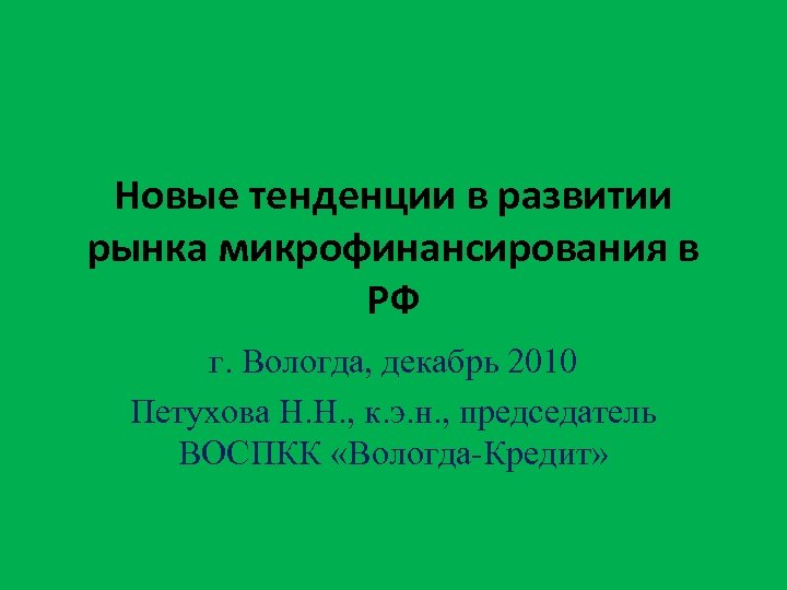 Новые тенденции в развитии рынка микрофинансирования в РФ г. Вологда, декабрь 2010 Петухова Н. Н. , к. э. н. , председатель ВОСПКК «Вологда-Кредит»