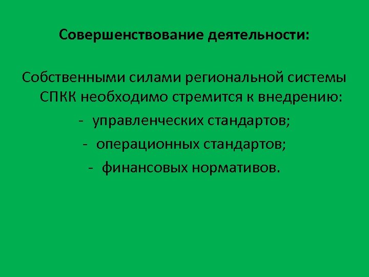 Совершенствование деятельности: Собственными силами региональной системы СПКК необходимо стремится к внедрению: - управленческих стандартов; - операционных стандартов; - финансовых нормативов.