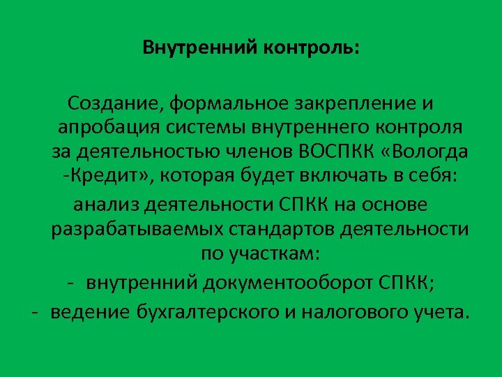 Внутренний контроль: Создание, формальное закрепление и апробация системы внутреннего контроля за деятельностью членов ВОСПКК «Вологда -Кредит» , которая будет включать в себя: анализ деятельности СПКК на основе разрабатываемых стандартов деятельности по участкам: - внутренний документооборот СПКК; - ведение бухгалтерского и налогового учета.