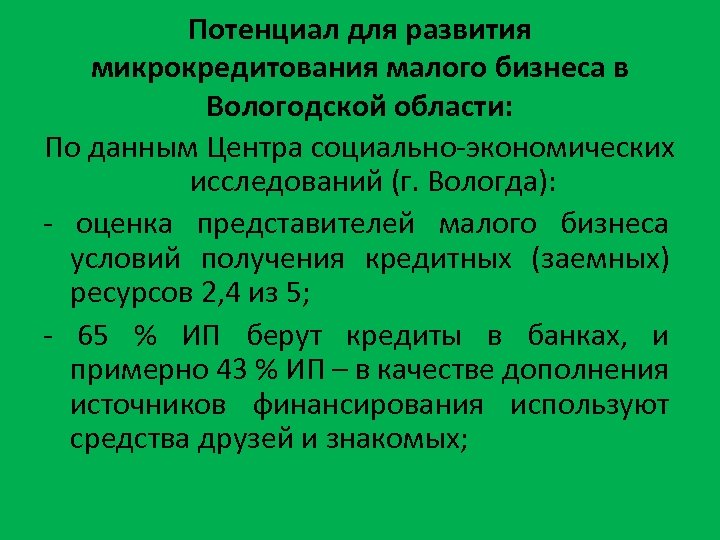 Потенциал для развития микрокредитования малого бизнеса в Вологодской области: По данным Центра социально-экономических исследований (г. Вологда): - оценка представителей малого бизнеса условий получения кредитных (заемных) ресурсов 2, 4 из 5; - 65 % ИП берут кредиты в банках, и примерно 43 % ИП – в качестве дополнения источников финансирования используют средства друзей и знакомых;