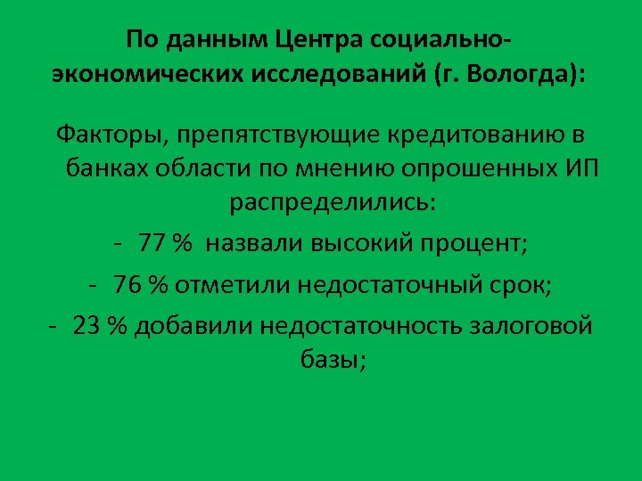 По данным Центра социальноэкономических исследований (г. Вологда): Факторы, препятствующие кредитованию в банках области по мнению опрошенных ИП распределились: - 77 % назвали высокий процент; - 76 % отметили недостаточный срок; - 23 % добавили недостаточность залоговой базы;