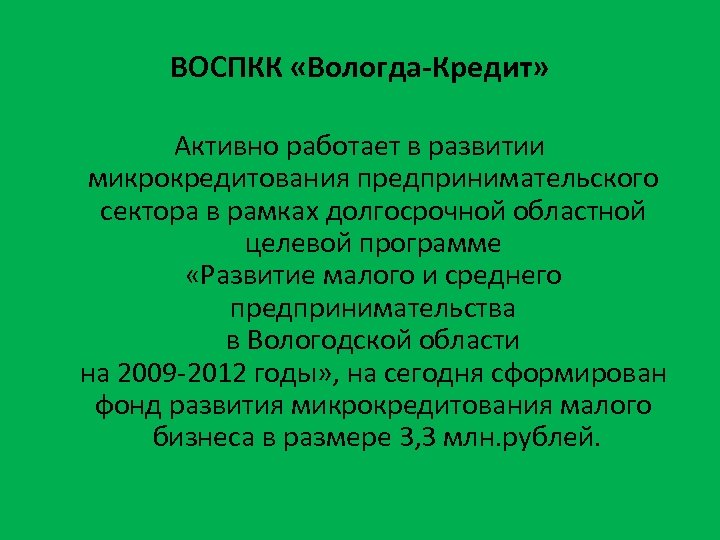 ВОСПКК «Вологда-Кредит» Активно работает в развитии микрокредитования предпринимательского сектора в рамках долгосрочной областной целевой программе «Развитие малого и среднего предпринимательства в Вологодской области на 2009 -2012 годы» , на сегодня сформирован фонд развития микрокредитования малого бизнеса в размере 3, 3 млн. рублей.