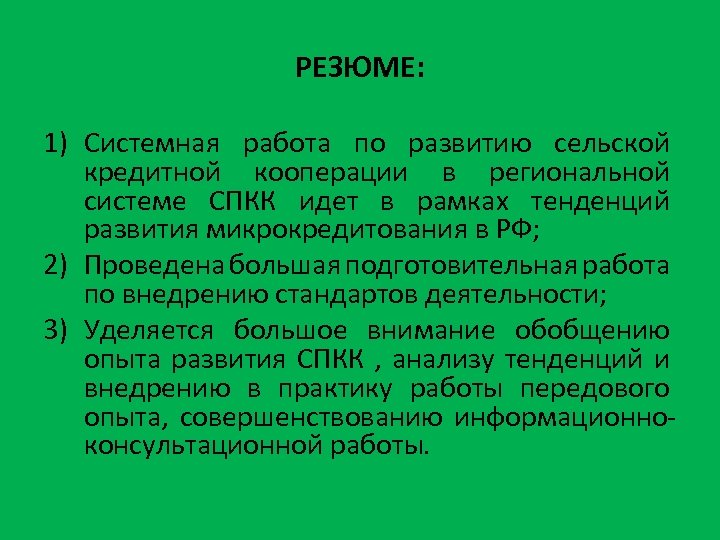 РЕЗЮМЕ: 1) Системная работа по развитию сельской кредитной кооперации в региональной системе СПКК идет в рамках тенденций развития микрокредитования в РФ; 2) Проведена большая подготовительная работа по внедрению стандартов деятельности; 3) Уделяется большое внимание обобщению опыта развития СПКК , анализу тенденций и внедрению в практику работы передового опыта, совершенствованию информационноконсультационной работы.