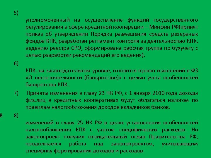 В 5) 6) уполномоченный на осуществление функций государственного регулирования в сфере кредитной кооперации – Минфин РФ(принят приказ об утверждении Порядка размещения средств резервных фондов КПК, разработан регламент контроля за деятельностью КПК, ведению реестра СРО, сформирована рабочая группа по бухучету с целью разработки рекомендаций его ведения). КПК, на законодательном уровне, готовится проект изменений в ФЗ «О несостоятельности (банкротстве)» с целью учета особенностей банкротства КПК. 7) Приняты изменения в главу 23 НК РФ, с 1 января 2010 года доходы физ. лиц в кредитных кооперативах будут облагаться налогом по правилам налогообложения доходов вкладчиков банков. 8) изменений в главу 25 НК РФ в целях установления особенностей налогообложения КПК с учетом специфических расходов. Но законопроект получил отрицательный отзыв Правительства РФ, продолжается работа над законопроектом, учитывающим специфику формирования доходов и расходов.