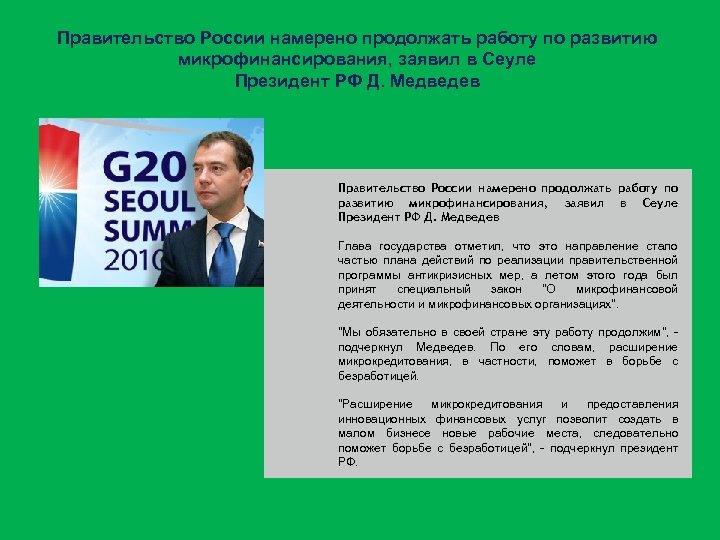 Правительство России намерено продолжать работу по развитию микрофинансирования, заявил в Сеуле Президент РФ Д. Медведев Правительство России намерено продолжать работу по развитию микрофинансирования, заявил в Сеуле Президент РФ Д. Медведев Глава государства отметил, что это направление стало частью плана действий по реализации правительственной программы антикризисных мер, а летом этого года был принят специальный закон "О микрофинансовой деятельности и микрофинансовых организациях". "Мы обязательно в своей стране эту работу продолжим", - подчеркнул Медведев. По его словам, расширение микрокредитования, в частности, поможет в борьбе с безработицей. "Расширение микрокредитования и предоставления инновационных финансовых услуг позволит создать в малом бизнесе новые рабочие места, следовательно поможет борьбе с безработицей", - подчеркнул президент РФ.