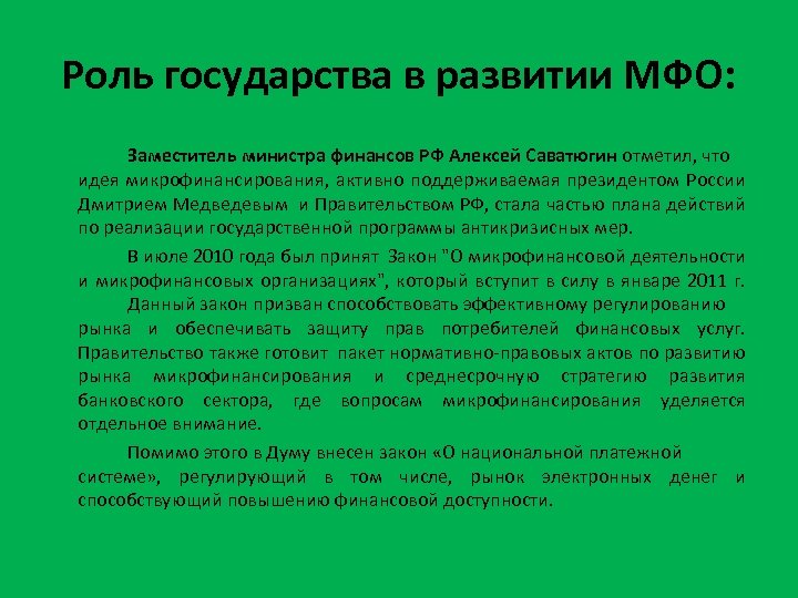Роль государства в развитии МФО: Заместитель министра финансов РФ Алексей Саватюгин отметил, что идея микрофинансирования, активно поддерживаемая президентом России Дмитрием Медведевым и Правительством РФ, стала частью плана действий по реализации государственной программы антикризисных мер. В июле 2010 года был принят Закон "О микрофинансовой деятельности и микрофинансовых организациях", который вступит в силу в январе 2011 г. Данный закон призван способствовать эффективному регулированию рынка и обеспечивать защиту прав потребителей финансовых услуг. Правительство также готовит пакет нормативно-правовых актов по развитию рынка микрофинансирования и среднесрочную стратегию развития банковского сектора, где вопросам микрофинансирования уделяется отдельное внимание. Помимо этого в Думу внесен закон «О национальной платежной системе» , регулирующий в том числе, рынок электронных денег и способствующий повышению финансовой доступности.