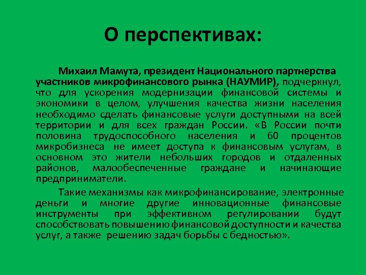 О перспективах: Михаил Мамута, президент Национального партнерства участников микрофинансового рынка (НАУМИР), подчеркнул, что для ускорения модернизации финансовой системы и экономики в целом, улучшения качества жизни населения необходимо сделать финансовые услуги доступными на всей территории и для всех граждан России. «В России почти половина трудоспособного населения и 60 процентов микробизнеса не имеет доступа к финансовым услугам, в основном это жители небольших городов и отдаленных районов, малообеспеченные граждане и начинающие предприниматели. Такие механизмы как микрофинансирование, электронные деньги и многие другие инновационные финансовые инструменты при эффективном регулировании будут способствовать повышению финансовой доступности и качества услуг, а также решению задач борьбы с бедностью» .