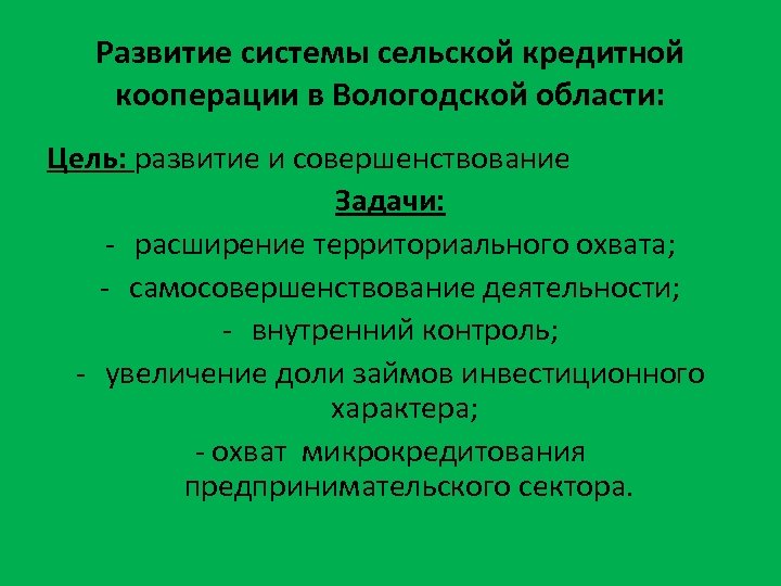 Развитие системы сельской кредитной кооперации в Вологодской области: Цель: развитие и совершенствование Задачи: - расширение территориального охвата; - самосовершенствование деятельности; - внутренний контроль; - увеличение доли займов инвестиционного характера; - охват микрокредитования предпринимательского сектора.