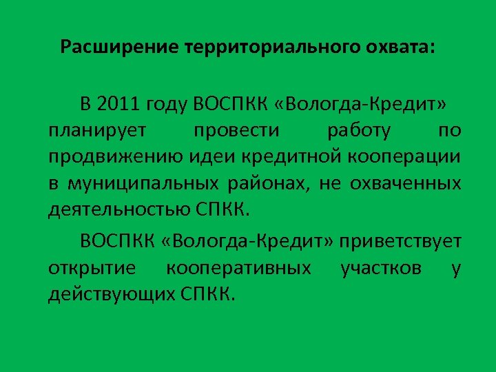 Расширение территориального охвата: В 2011 году ВОСПКК «Вологда-Кредит» планирует провести работу по продвижению идеи кредитной кооперации в муниципальных районах, не охваченных деятельностью СПКК. ВОСПКК «Вологда-Кредит» приветствует открытие кооперативных участков у действующих СПКК.