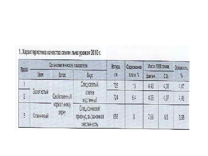 • В связи с этим исследовали 3 пробы льна, полученные от ГНУ ВНИИЛ: две (1 и 2) - лён светлоокрашенный масличный; одна (3) - лён темноокрашенный масличный. Все пробы урожая 2010 г. • • Пробы семян льна были проанализированы по стандартизированным показателям качества в соответствии с ГОСТ 10582 -76 «Семена льна масличного. Промышленное сырье. Технические условия» , разработчиком которого является ГНУ ВНИИЗ. Дополнительно были определены масса 1000 семян и зольность. Установлено, что по физическим свойствам сорта темно- и светлоокрашенных семян льна значительно различаются. •