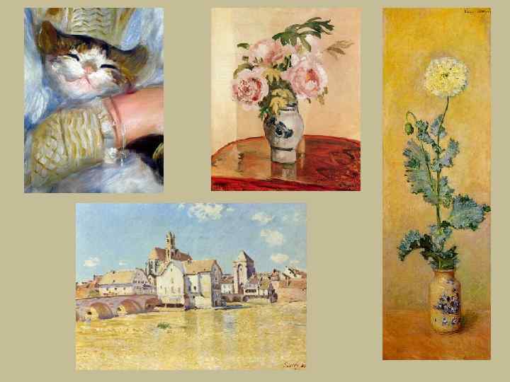 В 1870– 1880 -е годы формируется пейзаж французского импрессионизма: К. Моне, К. Писсарро, А. Сислей выработали последовательную систему пленэра, создавали в своих картинах ощущение сверкающего солнечного света, богатства красок природы, растворения форм в вибрации света и воздуха. Стараясь максимально точно выразить свои непосредственные впечатления от вещей, импрессионисты создали новый метод живописи. Его суть состояла в передаче внешнего впечатления света, тени, рефлексов на поверхности предметов раздельными мазками чистых красок, что зрительно растворяло форму в окружающей свето-воздушной среде. В излюбленных своих жанрах (пейзаже, портрете, многофигурной композиции) они стремились передать свои мимолетные впечатления от окружающего мира (сцены на улице, в кафе, зарисовки воскресных прогулок и т. п. ).