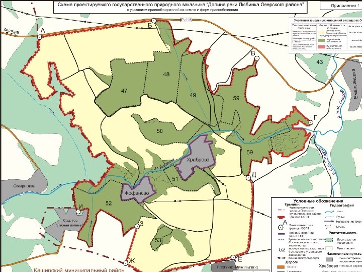 Зонирование. Предлагается создать три функциональные зоны: 1) зону сохранения биоразнообразия, лесные массивы, луга и пойма реки Любинка: природный заказник - ООПТ областного значения. 2) зону восстановления биоразнообразия, залежи и старопахотные поля, земли сельхозназначения, для реинтродукции редких видов растений и животных, реставрации нарушенных микроландшафтов. 3) хозяйственная зона. Зона муниципальных поселений (охранная зона ООПТ) - деревень Фофаново и Храброво. Питомник. Дендропарк. Каждая из зон будет иметь свой режим запрещенных и разрешенных видов деятельности, прописанный в паспорте на ООПТ. Проект поселения